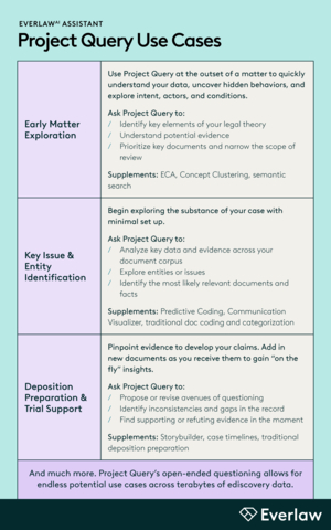 With those combined capabilities, Project Query is designed to uncover insights in an entire corpus of data sooner by simply asking questions related to specific issues, parties, or events and get answers in everyday conversational language in just seconds. Answers are supported with a list of facts and referenceable resources so users can dive deeper into the breakdown of information available as part of the response.