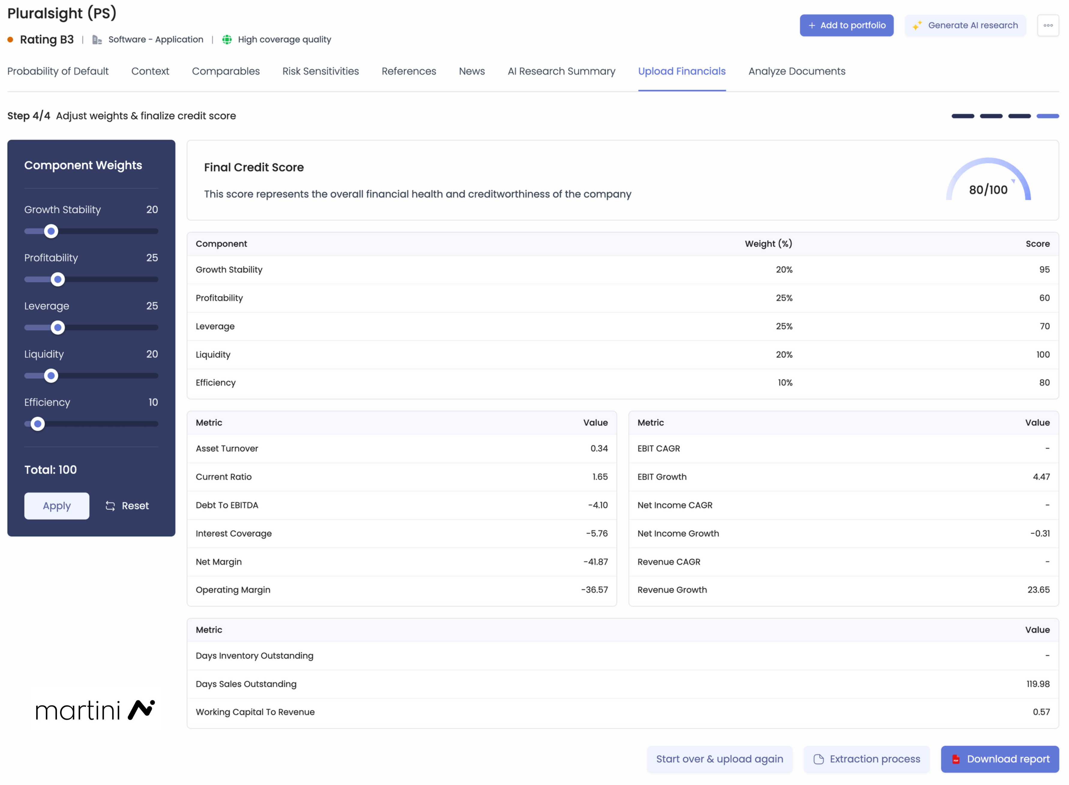 But AI doesn’t replace professional judgment — it enhances it. Credit professionals have full control over the process. While the agent does the heavy lifting, users can verify and correct extracted metrics, tweak benchmarks, and adjust credit scoring weights for a tailored analysis.