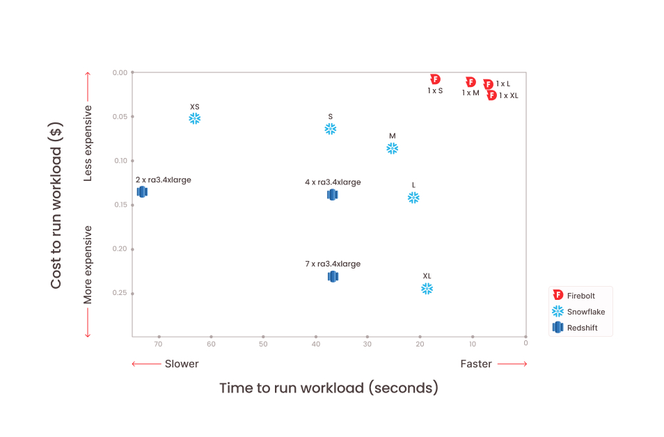 - To achieve Firebolt's performance characteristics, Snowflake is 37.5 times more expensive, whereas Redshift and BigQuery failed to achieve anywhere close to similar performance numbers.