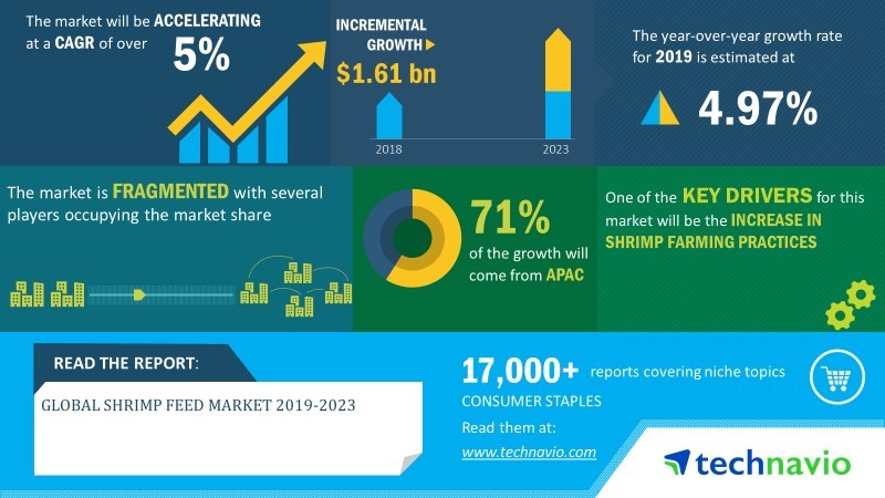 LONDON--(BUSINESS WIRE)--Technavio has been monitoring the global shrimp feed market since 2018 and the market is poised to grow by USD 1.61 billion during 2019-2023, progressing at a CAGR of over 5% during the forecast period. Request free sample pages