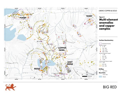 Property-wide surface exploration work by Libero collected 892 surface samples in 2019 in addition to 3,671 historical samples reported on May 27, 2019. Libero’s samples were analyzed for a suite of 35 elements, allowing for multi-element characterization of anomalies. This analysis has been undertaken and 19 target areas have been identified with anomalous gold-silver-copper plus other pathfinder elements, three of which had not been previously identified. These are illustrated in Figure 1 (gold) and Figure 2 (copper).