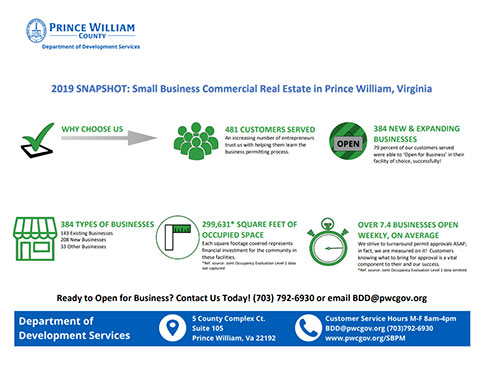PRINCE WILLIAM COUNTY, Va.--(BUSINESS WIRE)--Prince William County today announced 384 new small businesses opened in 2019, having received dedicated support from the Department of Development Services’ new Small Business Project Management Program. These projects reflect the continued growth and diversification of the County, with 208 new businesses, 143 existing businesses and 33 relocation/expansions. The broad spectrum of entrepreneurs, start-ups and businesses include: restaurants, retail, professional and technology services, residential services, and automobile repair shops, to name a few.