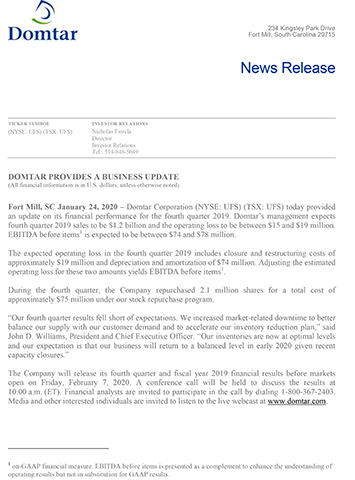 The Company will release its fourth quarter and fiscal year 2019 financial results before markets open on Friday, February 7, 2020. A conference call will be held to discuss the results at 10:00 a.m. (ET). Financial analysts are invited to participate in the call by dialing 1-800-367-2403. Media and other interested individuals are invited to listen to the live webcast at www.domtar.com.