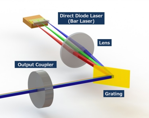 將來自多根二極體條[3]的100多台發射器與WBC技術結合,實現了高光束品質藍色雷射(波長帶= 400–450nm)的輸出功率最佳化。
