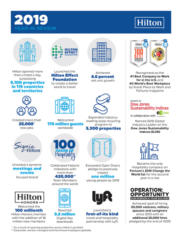 - 回馈当地社区,在近1.05万场活动中贡献了近55万个小时的志愿工作,同时将食品捐赠计划拓展至所有由希尔顿管理的美国和加拿大酒店