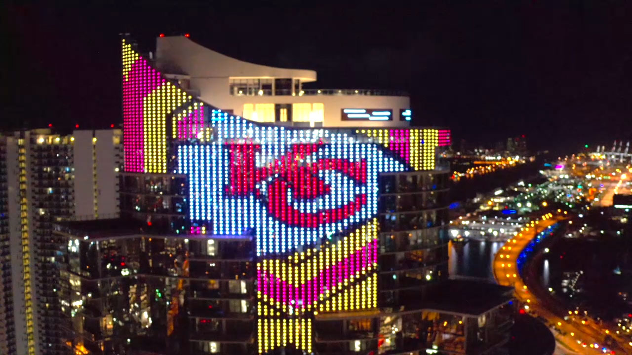 Fourteen-thousand-three-hundred (14,300) light emitting diodes on the 60-story Paramount Miami Worldcenter skyscraper have been ignited into a 200-foot-by-350-foot design of the Kansas City Chiefs Arrowhead logo along with a 700-foot vertical stream of the team’s colors and a top-floor emblem of the Super Bowl 54 Vince Lombardi Trophy.