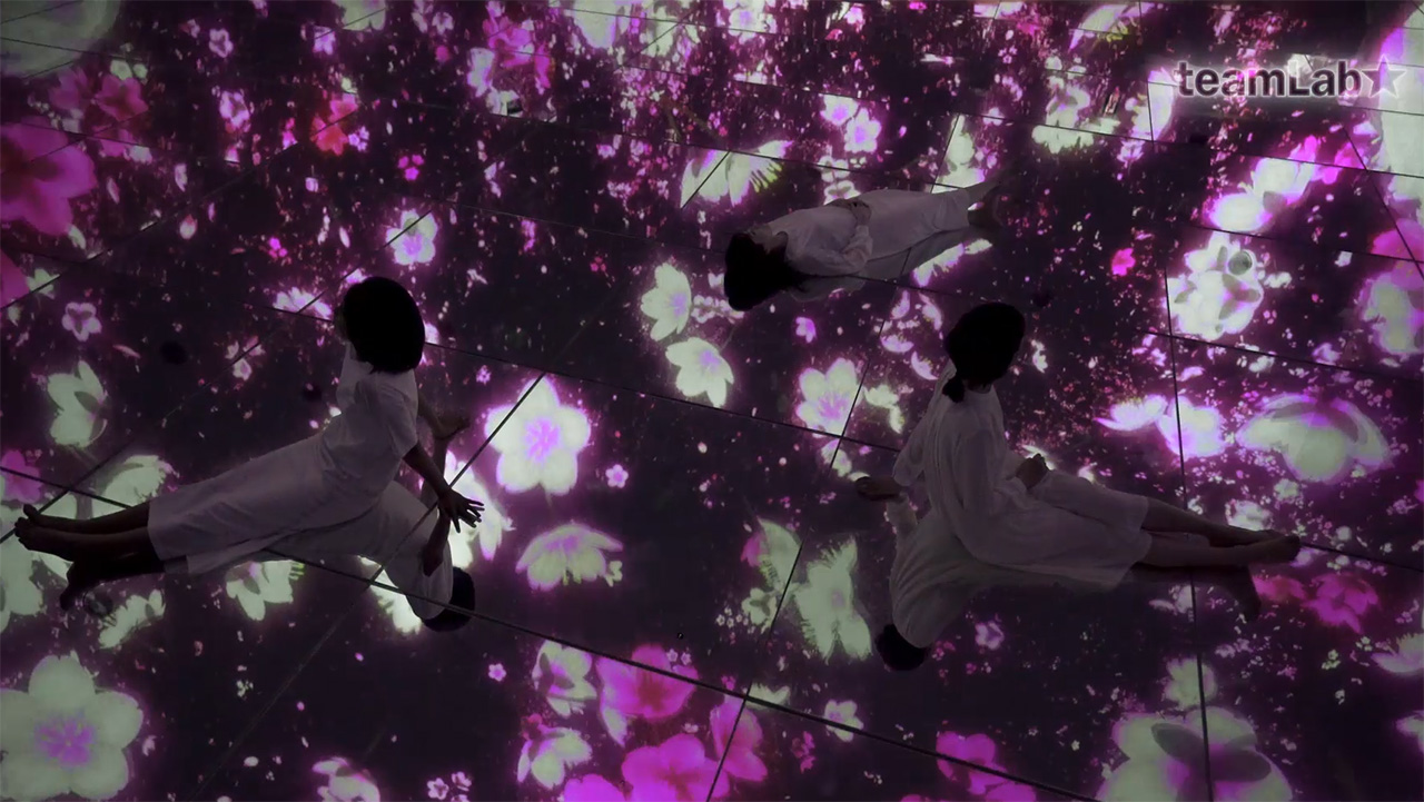 In einem anderen Kunstwerk, Drawing on the Water Surface Created by the Dance of Koi and People – Infinity, gehen Besucher barfuß durch echtes Wasser, während Koi über die unendliche Wasseroberfläche schwimmen. Wenn die Koi mit Menschen zusammenstoßen, verwandeln sie sich zu Kirschblüten. Die Blüten ändern sich in Echtzeit gemäß den jahreszeitlichen Veränderungen.