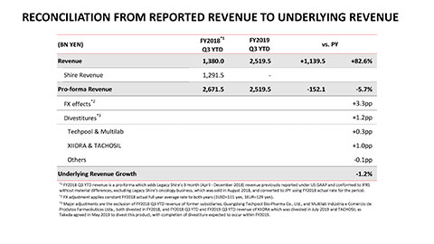 - 2018會計年度截至第三季擬制性營收基線代表武田2018會計年度截至第三季(4-12月)營收與同期夏爾營收之和,期間夏爾營收轉換為日圓的匯率為1美元=111日圓(2018會計年度平均匯率),而且從美國GAAP轉換為IFRS時沒有實質性區別;調整後的武田和夏爾營收排除了已脫售資產的營收。請參閱附錄查看詳情。
