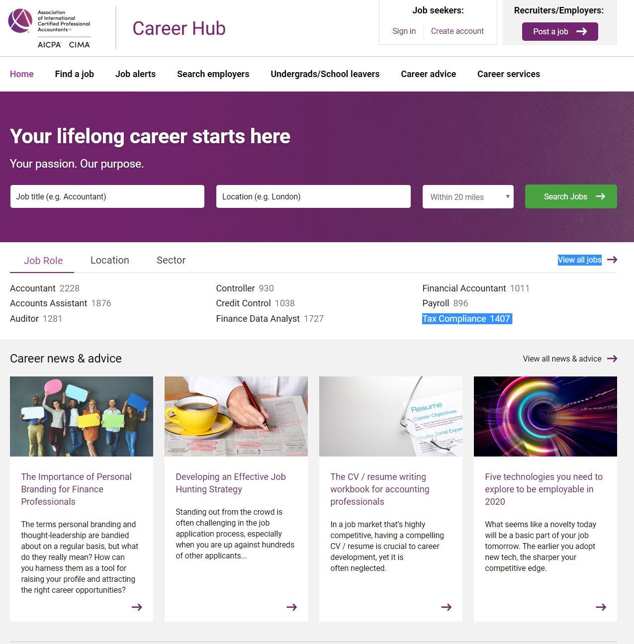 The Association’s Global Career Hub, combining the strengths of the AICPA and CIMA, offers a variety of resources and services for applicants and employers throughout the global finance industry. The site is open to all financial professionals, employers and recruiters.