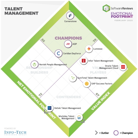 TORONTO--(BUSINESS WIRE)--SoftwareReviews announces its 2020 Talent Management Emotional Footprint Award winners, as determined by software users, who feel that four talent management software vendors have provided them with exceptional customer experiences. According to users’ answers to questions focused on satisfaction, which have been crafted by seasoned IT industry analysts at Info-Tech Research Group, the talent management vendor champions are: