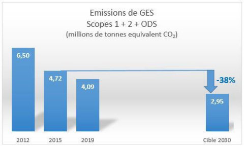 Cela se traduit, pour le Groupe, par un objectif de réduction de ses émissions absolues de plus de 1,7 millions de tonnes en équivalent CO2 par rapport à 2015 pour atteindre moins de 3 millions de tonnes en 2030, quelle que soit l’augmentation de ses volumes de production, soit une baisse de 38% sur 15 ans.