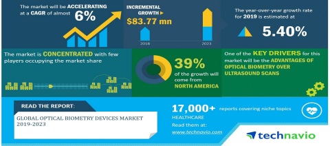 LONDON--(BUSINESS WIRE)--Technavio has been monitoring the global optical biometry devices market since 2018 and the market is poised to grow by USD 83.77 million during 2019-2023, progressing at a CAGR of almost 6% during the forecast period. Request free sample pages