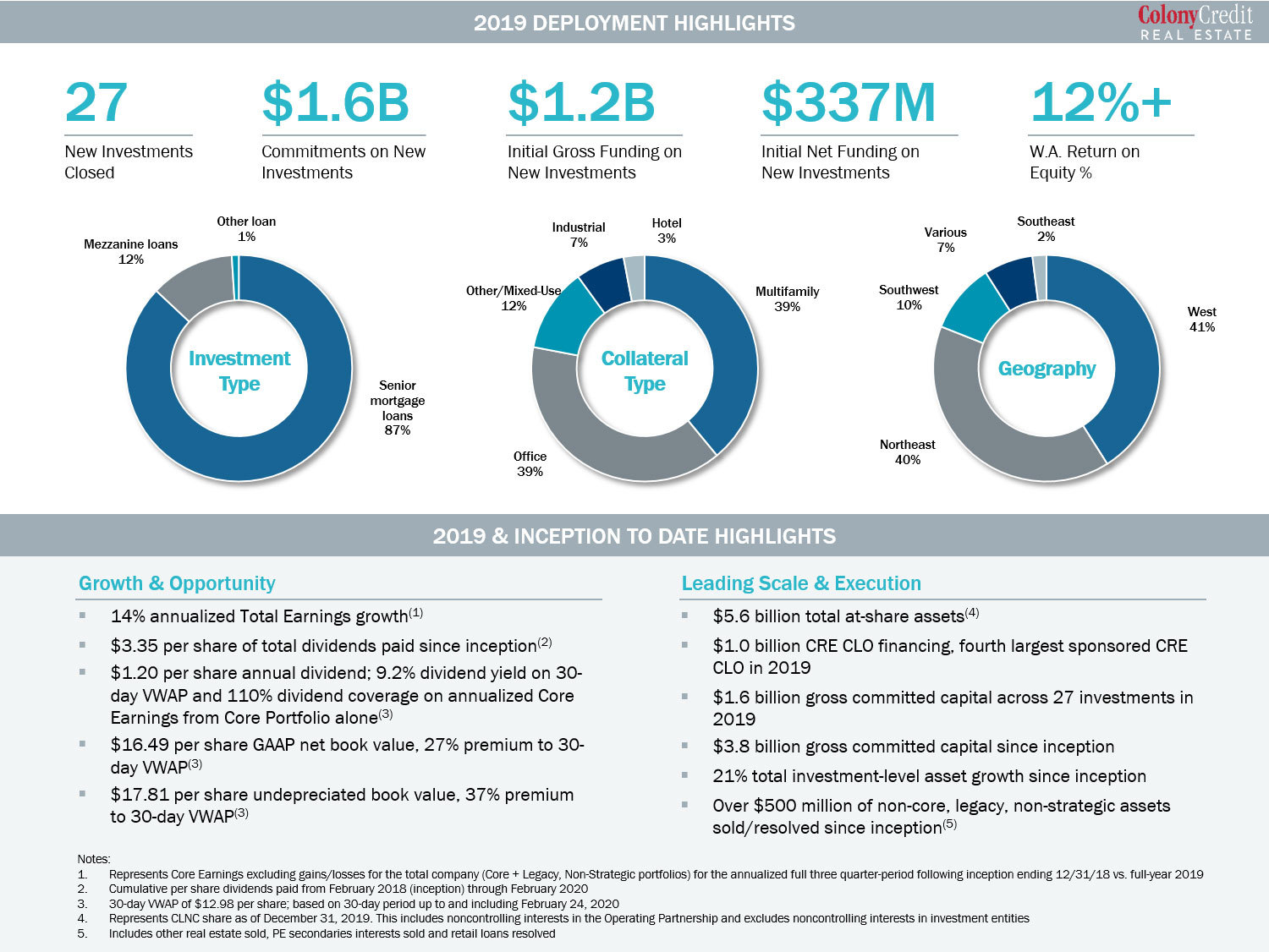 We present Return on Equity (“ROE”), which is a supplemental financial measure that represents the initial net investment-level earnings generated by an investment expressed as a percentage of the net equity capital invested. The Company calculates net investment-level earnings for investments in loans and CRE debt securities as the sum of the stated cash coupon income and any non-cash income (such as payment in-kind income and amortization/accretion of purchase discounts and origination, extension and exit fees) less investment-level financing costs. For investments in net leased real estate, the Company calculates net investment-level earnings by subtracting investment-level financing costs from net operating income. Net equity capital invested is calculated by taking the gross initial invested capital less any financing. With respect to certain loans and investment level financing, the Company assumes the one-month USD LIBOR as of December 31, 2019 when calculating ROE. The Company’s ROE calculation relies on a number of assumptions and estimates that are subject to change, some of which are outside the control of the Company. Actual results may differ materially from the Company’s expectations. As such, there can be no assurance that the actual ROE will be equivalent to the estimated ROE. In addition, the Company’s methodology for calculating ROE may differ from methodologies employed by other companies to calculate the same or similar supplemental financial measures, and accordingly, the presented ROE may not be comparable to the ROE reported by other companies.