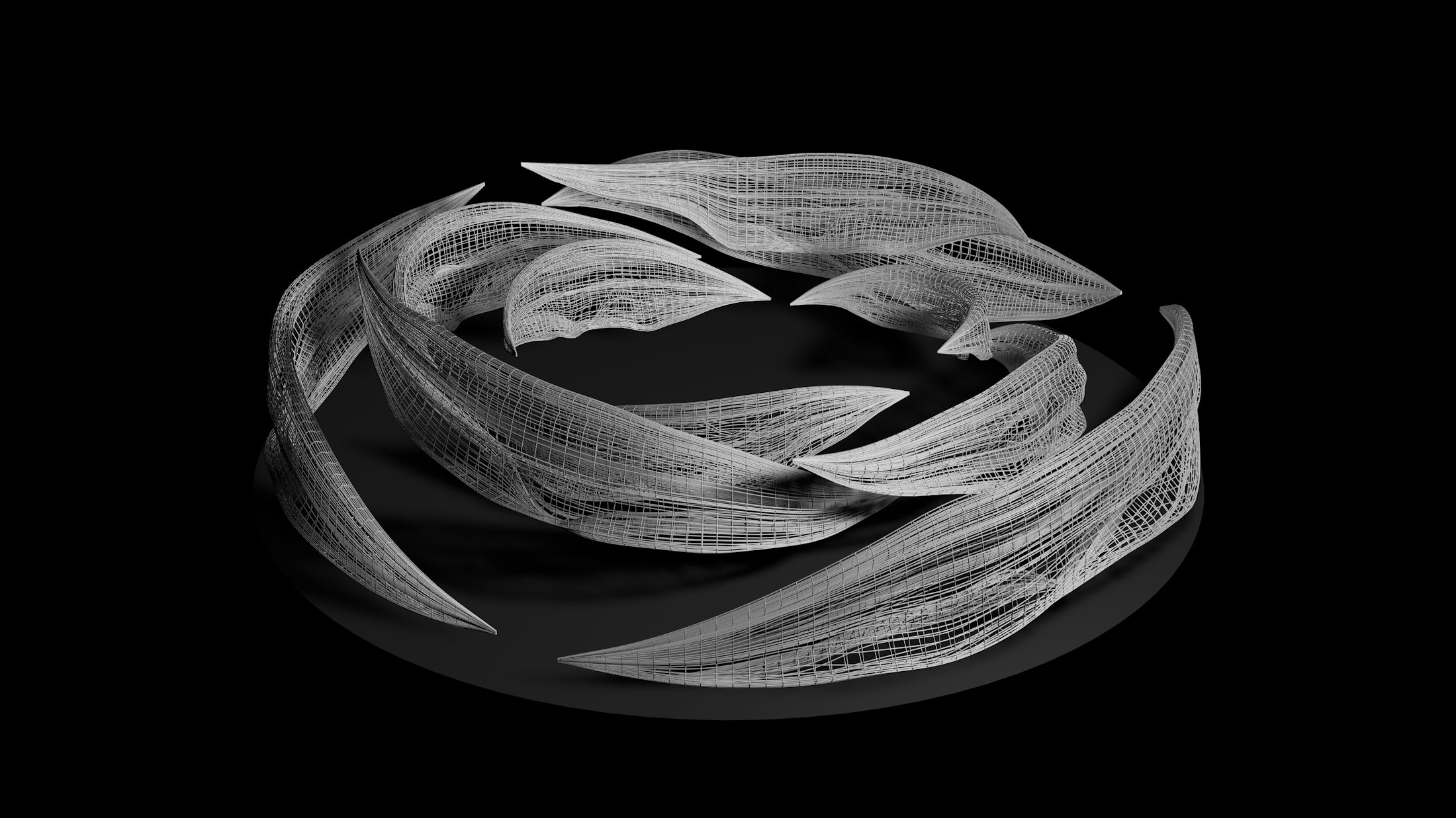 许多个网状物体旋转着,随着光线的照射,他们似乎在不断走动。这代表着在大火后走向首里城的人们,艺术家将他们记录下来,并使之形象化。过去首里城也曾被大火烧毁,每一次都在人们的关注和美好祝愿下被重建。在光线的逐步显现下,人们走向首里城,形成漩涡,蜿蜒起伏,出现在观赏者的眼前。