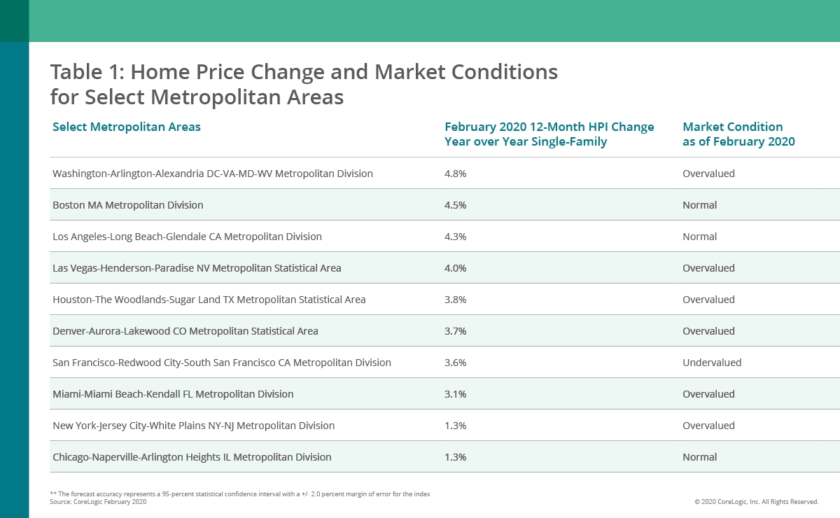 “Before the onset of the pandemic, the quickening of home price growth during the first two months of 2020 highlighted the strength of purchase activity,” said Dr. Frank Nothaft, chief economist at CoreLogic. “In February, the national unemployment rate matched a 50-year low, mortgage rates fell to the lowest level in more than three years and for-sale inventory remained lean, all contributing to the pickup in value growth.”
