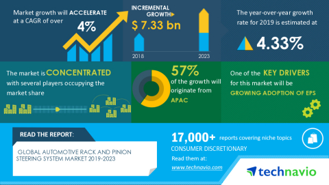 LONDON--(BUSINESS WIRE)--Technavio has been monitoring the automotive rack and pinion steering system market and it is poised to grow by USD 7.33 bn during 2019-2023, progressing at a CAGR of over 4% during the forecast period. The report offers an up-to-date analysis regarding the current market scenario, latest trends and drivers, and the overall market environment.