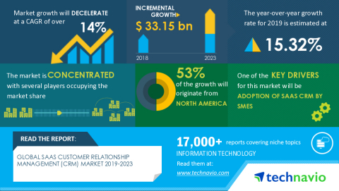 LONDON--(BUSINESS WIRE)--Technavio has been monitoring the SaaS customer relationship management (CRM) market and it is poised to grow by USD 33.15 bn during 2019-2023. The report offers an up-to-date analysis regarding the current market scenario, latest trends and drivers, and the overall market environment.