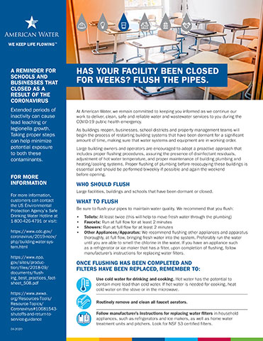 Pennsylvania American Water encourages building owners and operators whose facilities have been closed to adopt a proactive approach that includes proper flushing procedures, assuring the presence of disinfectant residuals, adjustment of hot water temperature, and proper maintenance of building plumbing and heating/cooling systems. Proper flushing of plumbing before reoccupying these buildings is essential to maintain water quality and should be performed biweekly while the building is closed, if possible, and again the weekend before opening.