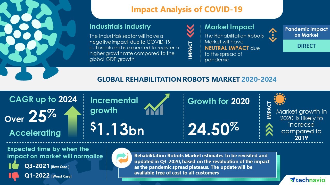 LONDON--(BUSINESS WIRE)--Rehabilitation robots market research report provides detailed analysis on emerging market trends, regional outlook, competitive landscape, and a comprehensive analysis on different market segments. The global rehabilitation robots market is poised to grow by USD 1.13 billion during 2020-2024, progressing at a CAGR of over 25% during the forecast period.