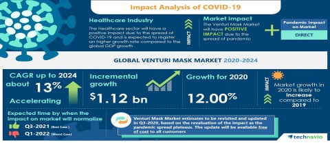 LONDON--(BUSINESS WIRE)--The global venturi mask market is expected to grow by USD 1.12 billion as per Technavio. This marks a significant market growth compared to the 2019 growth estimates due to the impact of the COVID-19 pandemic in the first half of 2020. Steady growth is expected to continue throughout the forecast period, and the market is expected to grow at a CAGR of about 13%.