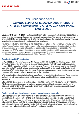 LONDEN--(BUSINESS WIRE)--Stallergenes Greer, een biofarmaceutisch bedrijf dat gespecialiseerd is in behandelingen voor luchtwegallergieën, kondigt de uitbreiding van supply of subcutaneous products (SCIT) aan, waardoor het aanbod aan patiënten en de medische gemeenschap verder wordt uitgebreid door een duurzame investering in kwaliteit en operationele uitmuntendheid.