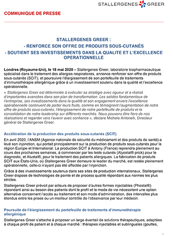 LONDRA--(BUSINESS WIRE)--Stallergenes Greer, società biofarmaceutica specializzata nei trattamenti contro le allergie respiratorie, annuncia l'espansione della sua linea di prodotti sottocutanei (SCIT) mirata ad ampliare ulteriormente l'offerta per pazienti e comunità medica, grazie agli investimenti continuativi nella qualità e nell'eccellenza operativa.