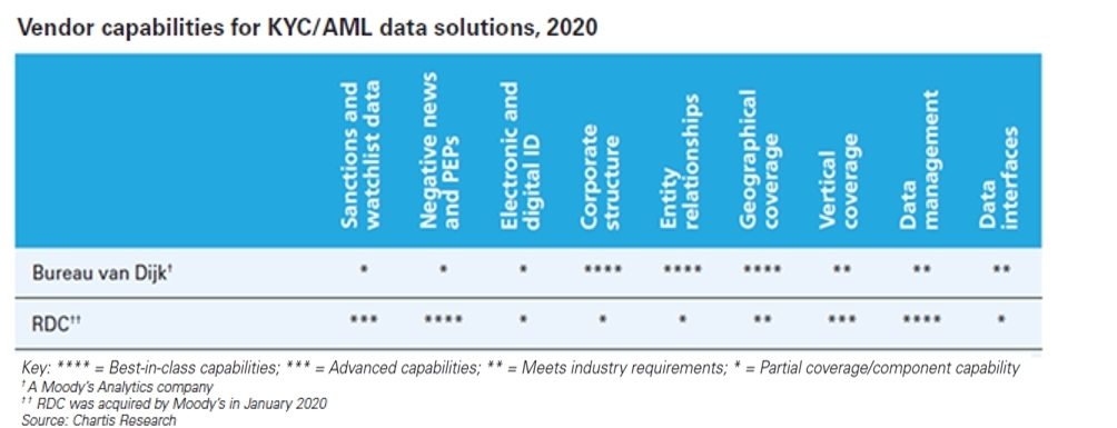 NEW YORK--(BUSINESS WIRE)--Bureau van Dijk, una società di Moody’s Analytics e la DataCorp (RDC) normativa, che Moody's ha acquisito in gennaio, sono Category Leaders in un nuovo rapporto di ricerca Chartis. KYC/AML Data Solutions, 2020: Market and Vendor Landscape è un rapporto che valuta 15 importanti fornitori di Know Your Customer (KYC) e soluzioni di dati anti-riciclaggio di denaro (AML).