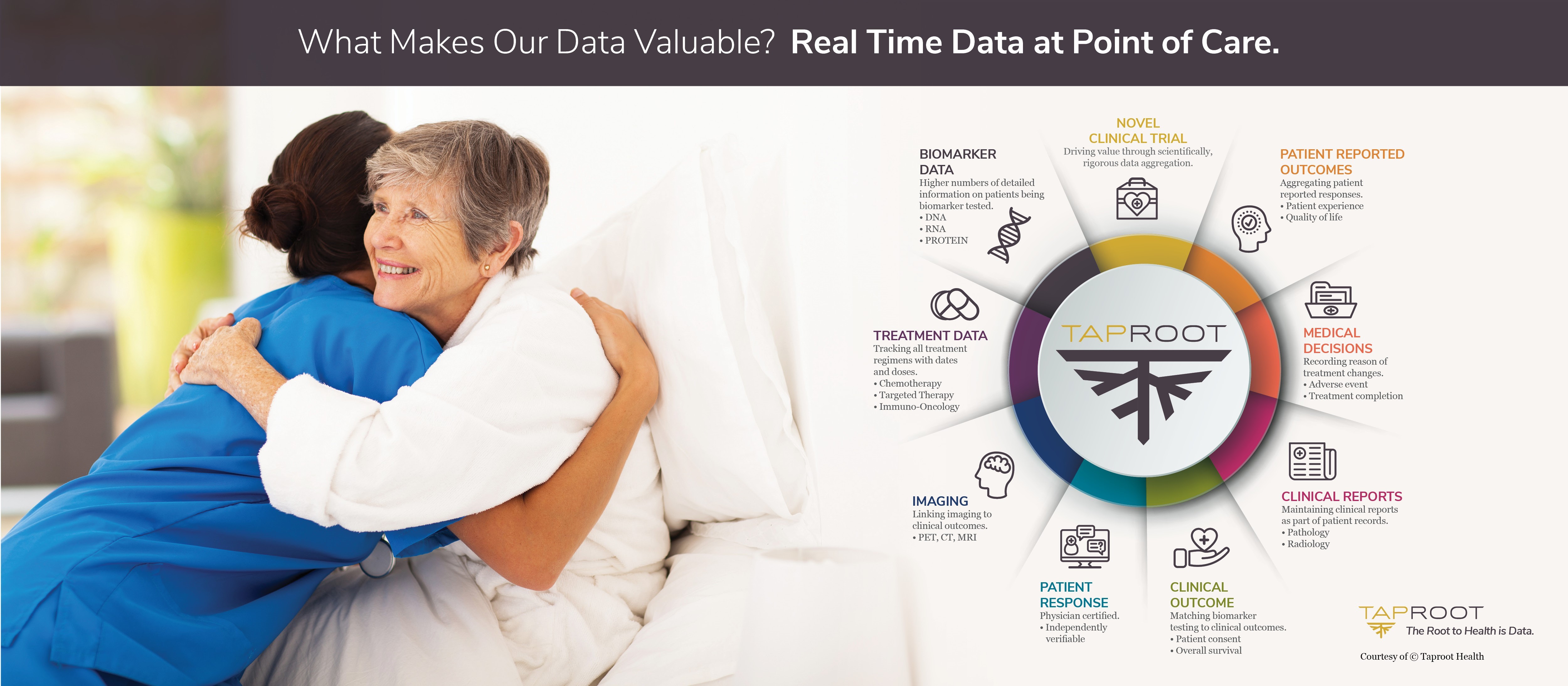 2. Combines patient data with research-grade clinical data from oncologists. Taproot brings the ability to collect real-world, real-time observational data and combine it with research-grade clinical data from practicing oncologists. It’s the ability to combine patient and clinical data that makes Taproot’s database so valuable to all oncology stakeholders.