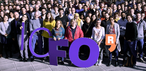 ICFONIANS UNITED: Researchers, staff, and students celebrate their logo. The “R” stands for "recerca," the Catalan word for “research." This was part of the original branding of the research institutes established by the government of Catalonia a little over 20 years ago, and ICFO retains it in their logo. (Photo: Business Wire)