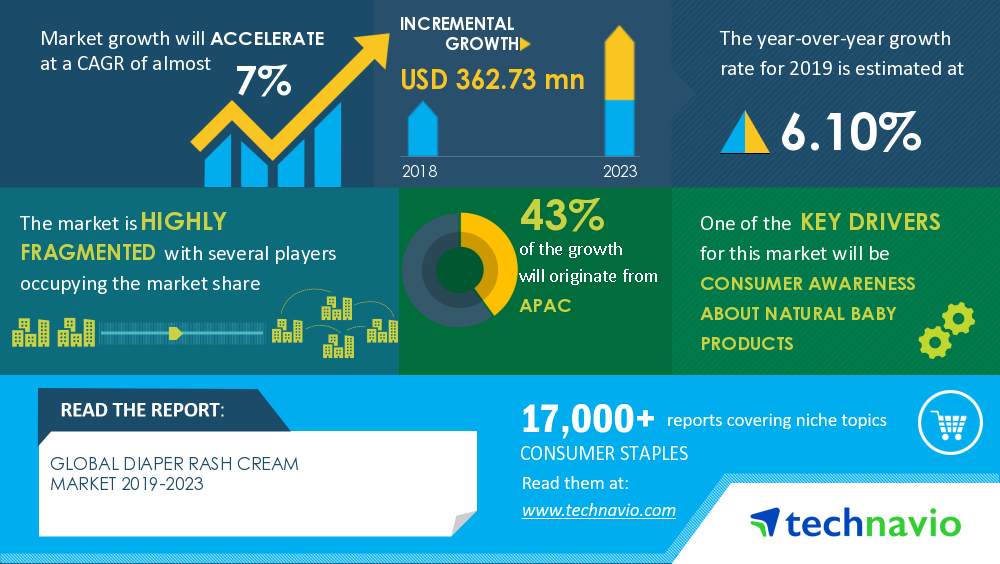 LONDON--(BUSINESS WIRE)--Technavio has been monitoring the diaper rash cream market and it is poised to grow by USD 362.73 million during 2019-2023, progressing at a CAGR of 7% during the forecast period. The report offers an up-to-date analysis regarding the current market scenario, latest trends and drivers, and the overall market environment.