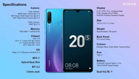 Con HONOR 20S, gli utenti possono scegliere tra tre eleganti colori: Bianco perla, blu pavone e nero mezzanotte.