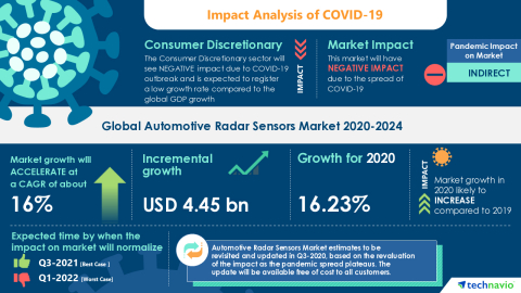 LONDON--(BUSINESS WIRE)--Technavio has been monitoring the automotive radar sensors market and it is poised to grow by USD 4.45 billion during 2020-2024, progressing at a CAGR of 16% during the forecast period. The report offers an up-to-date analysis regarding the current market scenario, latest trends and drivers, and the overall market environment.