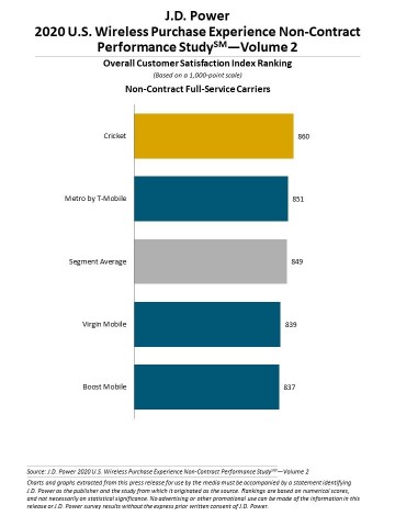 Among non-contract full-service carriers, Cricket ranks highest for a third consecutive volume, with a score of 860. Metro by T-Mobile (851) ranks second.