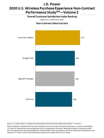 For non-contract value carriers, Consumer Cellular ranks highest for a ninth consecutive volume, with a score of 877. Straight Talk (845) ranks second.