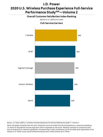 Among full-service carriers, T-Mobile ranks highest for a sixth consecutive volume, with a score of 863. AT&T (853) ranks second.