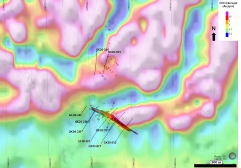 The completed drill program totalled 2,895 m in nine diamond drill holes with seven drill holes in the “A” Zone and two drill holes in the “C” Zone. The drill program metreage was increased from the planned program of 2,300 m in ten drill holes as deeper holes were drilled on two targets (GK20-026 EOH 552 m and GK20-027 EOH 555 m) in order to fully test the targets. Drill hole collar data is included in Table 1 with location maps below.