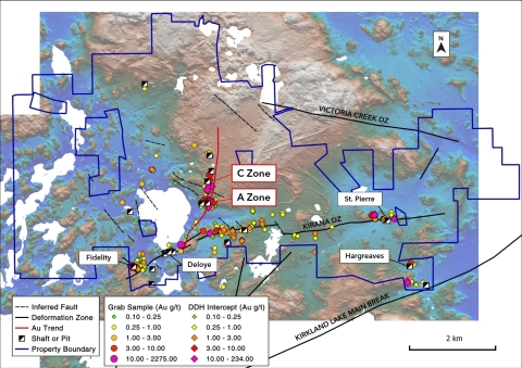 The Goodfish-Kirana property is roughly 11.5 km x 3 km (34 km2) and contains three major structural trends: the east-west trending Kirana Deformation Zone; the northeast trending Goodfish Deformation Zone; and the Victoria Creek Deformation Zone on the recently acquired Sutton claims on the northeast side of the property. The Property contains numerous historical gold showings, as well as 18 historical pits and shafts.