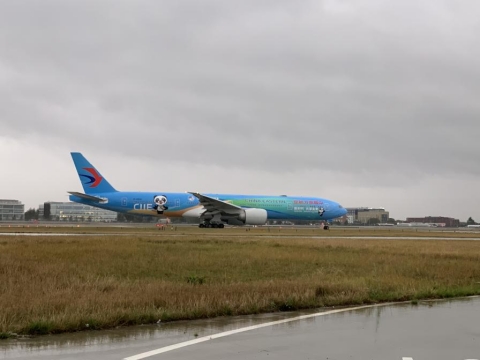 Il s’agit d’un Boeing 777-300ER de modèle phare de long courrier international de CEA. L’avion est peint en jaune et en bleu, couleurs thématiques de la CIIE, et est figuré le panda mascotte « Jinbao » comme son rôle principal, qui tient le trèfle à quatre feuilles pour exprimer ses bénédictions aux gens.