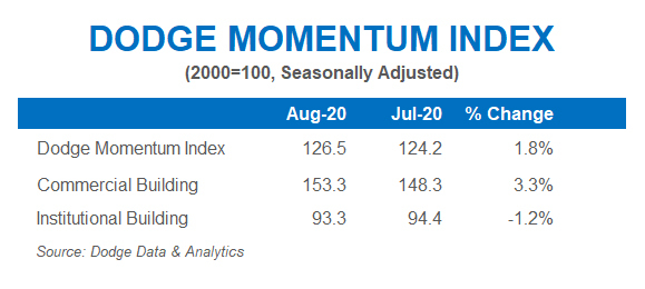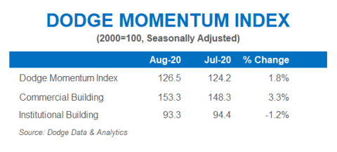 HAMILTON, N.J.--(BUSINESS WIRE)--The Dodge Momentum Index increased 1.8% in August to 126.5 (2000=1000) from the revised July reading of 124.2. The Momentum Index, issued by Dodge Data & Analytics, is a monthly measure of the first (or initial) report for nonresidential building projects in planning, which have been shown to lead construction spending for nonresidential buildings by a full year. In August, the commercial component rose 3.3%, while the institutional component moved 1.2% lower.