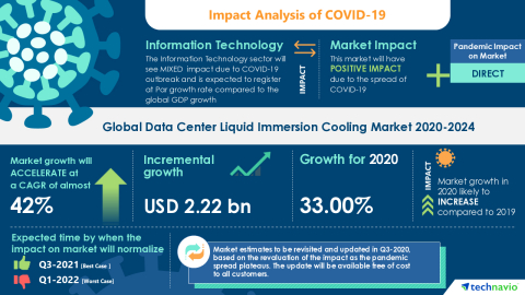 LONDON--(BUSINESS WIRE)--Technavio has been monitoring the data center liquid immersion cooling market and it is poised to grow by USD 2.22 bn during 2020-2024, progressing at a CAGR of almost 42% during the forecast period. The report offers an up-to-date analysis regarding the current market scenario, latest trends and drivers, and the overall market environment.