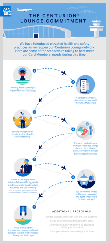 持卡人將體驗新的健康安全措施,例如座椅保持社交距離,減少接待量,增加清潔頻率,進入貴賓室時要求佩戴口罩,用上菜形式代替自助餐等等。如欲體驗非接觸式報到,持卡人可下載American Express® App,使用行動報到功能。這些措施將持續接受重新評估,以考慮持卡人的需求以及州和當地政府和衛生主管當局的要求。請點選這裡瞭解更多資訊:thecenturionlounge.com/reopening。