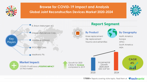 LONDON--(BUSINESS WIRE)--The joint reconstruction devices market is expected to grow by USD 5.07 billion during 2020-2024, according to Technavio. The report offers a detailed analysis of the impact of the COVID-19 pandemic on the joint reconstruction devices market in optimistic, probable, and pessimistic forecast scenarios.