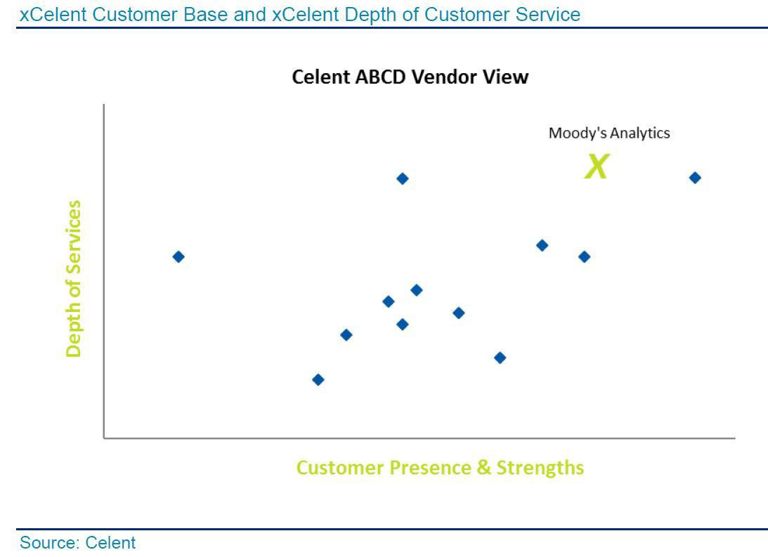 Celent研究主管Cubillas Ding表示:「除軟件和嵌入式分析外,穆迪分析還整合並提供與總體經濟研究、分析和見解有關的其他加值服務;實體與市場數據(基本面數據、信用數據、瞭解你的客戶(KYC)以及結構化金融數據);情境設定/生成;以及針對終端客戶的風險管理學習/培訓服務等。」