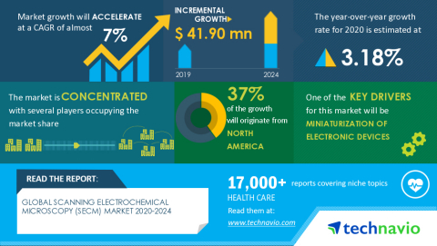LONDON--(BUSINESS WIRE)--The scanning electrochemical microscopy (SECM) market size is set to grow by USD 41.9 million accelerating at a CAGR of almost 7%, during the period spanning over 2020-2024. One of the key factors driving growth is the miniaturization of electronic devices. The ongoing trend of miniaturization has led semiconductor manufacturers to focus on reducing the size of semiconductor wafers and increase the energy efficiency of ICs. The extensive use of SECM in research on corrosion is a significant trend that will further stimulate market growth. SECM is widely adopted for studying numerous factors, including electron transfer kinetics, surface microstructure, initiation and propagation of pitting, and the effectiveness of protective measures such as treatments, inhibitors, and coatings.