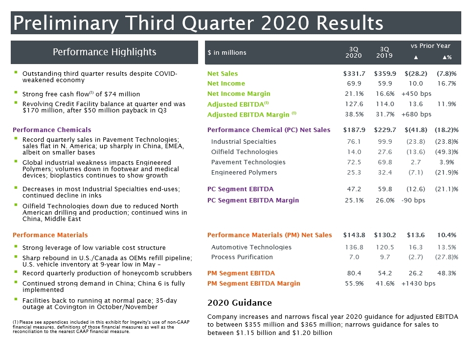 - Ingevity’s results were driven by global automotive demand and production rebound versus weak second quarter, continued strong paving activity, cost reduction actions and strong execution
