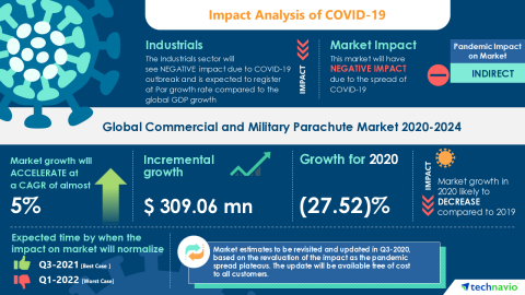 - As the business impact of COVID-19 spreads, the global commercial and military parachute market 2020-2024 is expected to have negative growth. As the pandemic spreads in some regions and plateaus in other regions, we revaluate the impact on businesses and update our report forecasts.