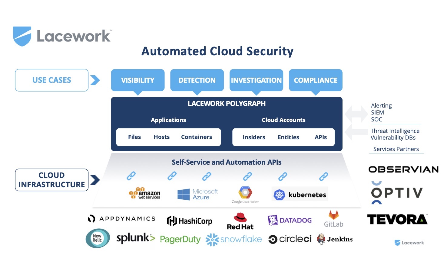 To support DevOps teams tasked with securing the complete lifecycle of cloud workloads, Lacework supports a rich ecosystem of Technology Partners. These integrations span a wide range of CI/CD platforms (Gitlab, CircleCi, and Jenkins), infrastructure-as-code automation tools (Terraform), incident response (PagerDuty), performance monitoring (DataDog, New Relic), and data analytics (Snowflake), among others.