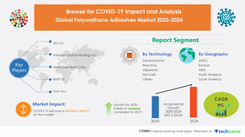 LONDON--(BUSINESS WIRE)--The polyurethane adhesives market is expected to grow by USD 2.25 billion during 2020-2024, according to Technavio. The report offers a detailed analysis of the impact of COVID-19 pandemic on the polyurethane adhesives market in optimistic, probable, and pessimistic forecast scenarios.