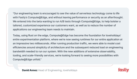全球邊緣雲端平台供應商--(BUSINESS WIRE)--(美國商業資訊)-- Fastly, Inc. (NYSE: FSLY) 宣佈其 Compute@Edge 迎來重大改進,新增了開發團隊工具和功能。客戶現在可以在 Compute@Edge 上執行生產流量,包括等候室token、動態邊緣用戶化、邊緣身分認證、完整無伺服器應用程式等各種創新用例。藉由Compute@Edge 的增強型工具,開發人員能夠針對前所未有的網路流量水準以及圍繞數位體驗的更高期望進行架構,同時將效能、效率和安全性放在首位。