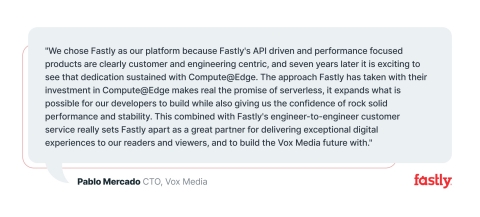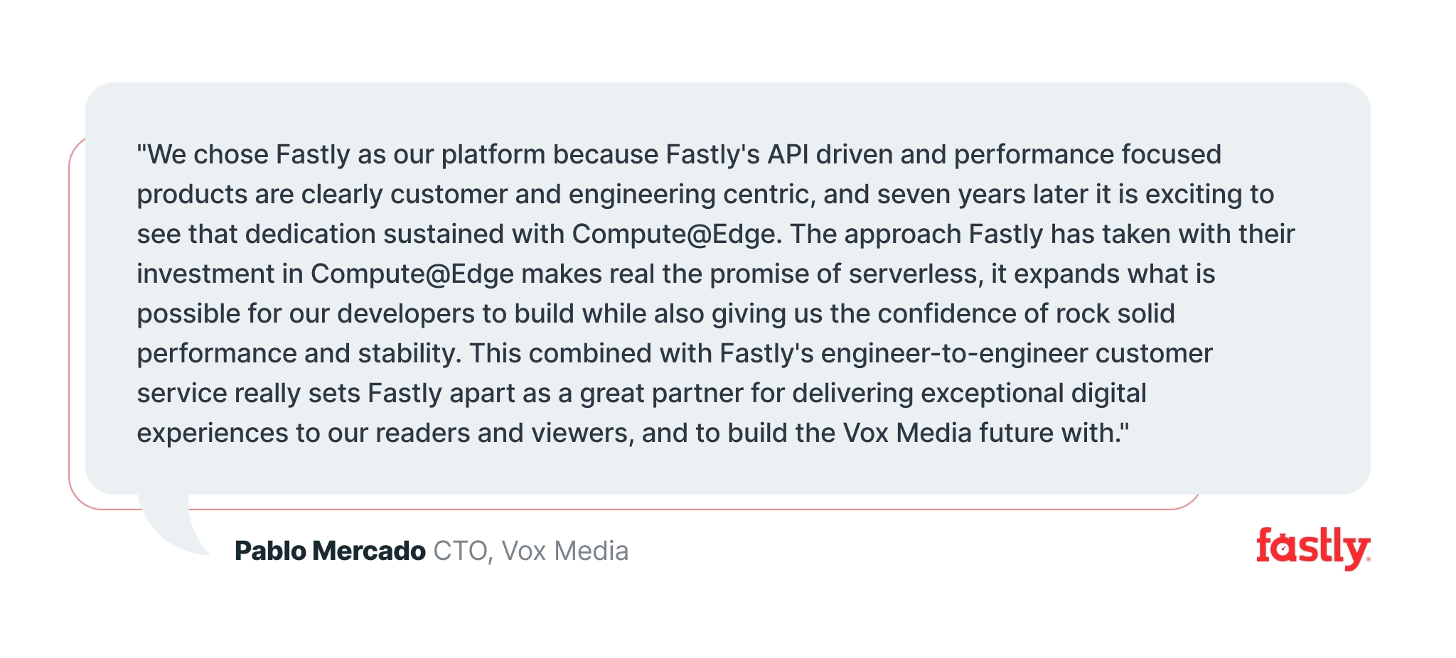 「七年前,我們選擇與 Fastly 合作是因為 Fastly 以客戶和工程為中心,平台由 API 主導且注重效能。直到今天,這樣的敬業精神在 Compute@Edge 上持續脫穎而出,我們感到十分興奮。」Vox Media 技術長 Pablo Mercado 表示,「Fastly 對 Compute@Edge 採行的投資使無伺服器的承諾成為現實,它拓展了開發團隊建構工作的可能性,同時也讓我們對可靠的效能和穩定性充滿信心。這一因素加上 Fastly 工程師對工程師的客戶服務,使 Fastly 真正出類拔萃,為我們的讀者和觀眾提供卓越數位體驗,成為Vox Media 共創未來的優秀合作夥伴。」